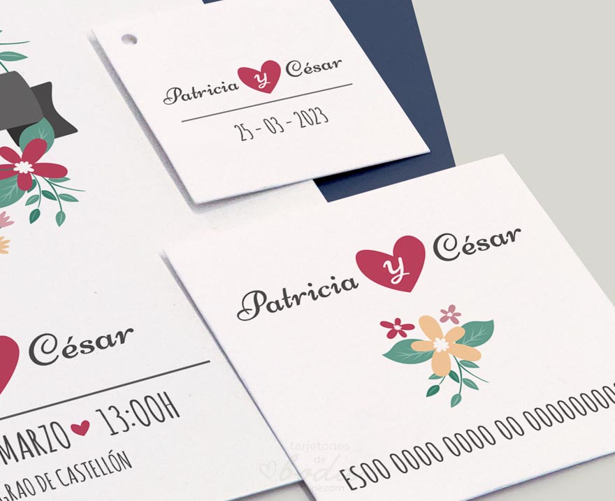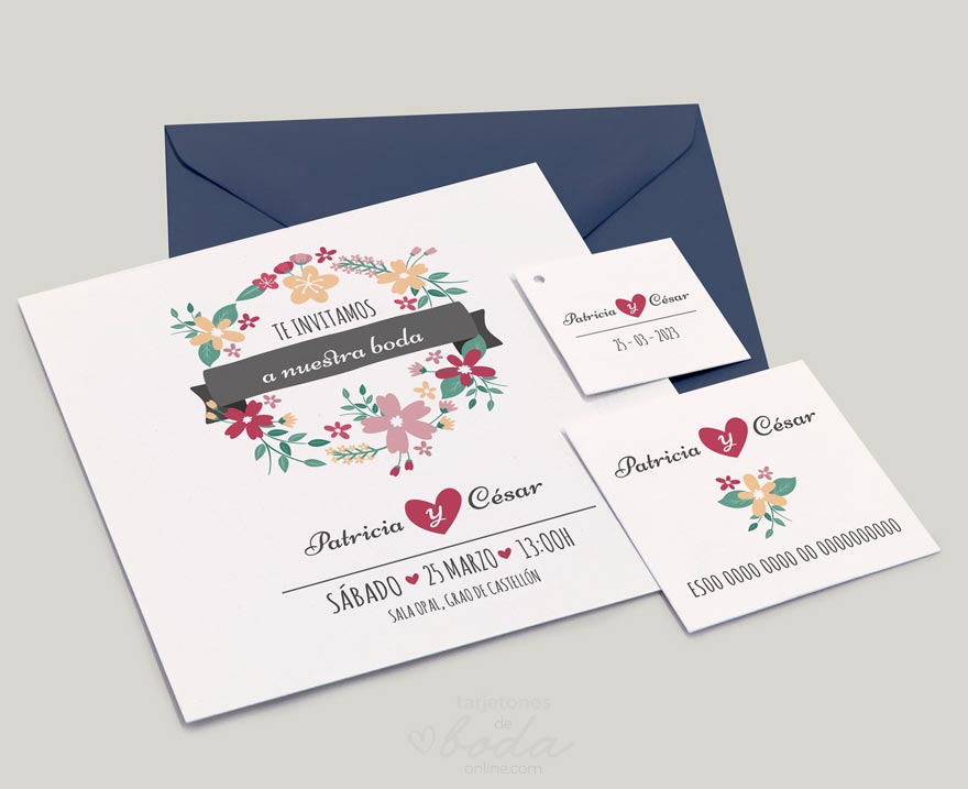 Junto a los tarjetones de boda están incluidas dos tarjetas adicionales sin ningún coste extra, a elegir entre tarjeta de banco, detalle o agradecimiento.